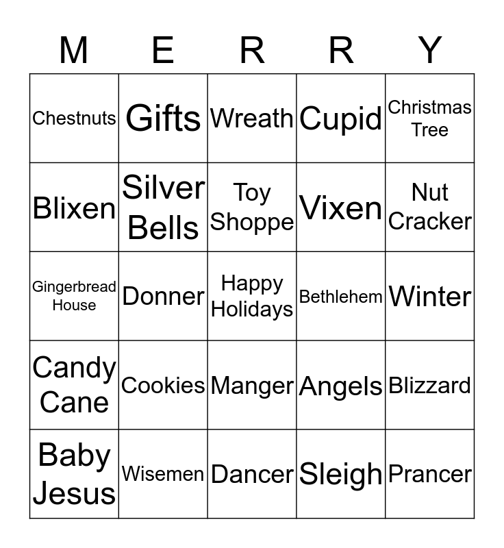 This bingo card has a free space and 34 words: Jack Frost, Sleigh, Ms.Claus, Jolly, Candy Cane, Silver Bells, Christmas Tree, Baby Jesus, Gifts, Rudolph, Toy Shoppe, Wreath, Snowflake, Mistletoe, Bethlehem, Nut Cracker, Wisemen, Gingerbread House, Cookies, Angels, Manger, Santa, Chestnuts, Winter, Dancer, Prancer, Cupid, Comet, Vixen, Blixen, Dasher, Donner, Blizzard and Elf.