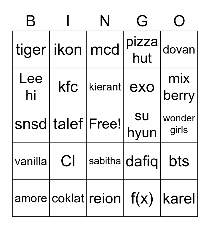 This bingo card has a free space and 24 words: Cl, coklat, kierant, amore, dovan, tiger, Lee hi, ikon, su hyun, sabitha, exo, snsd, dafiq, bts, kfc, f(x), wonder girls, mcd, mix berry, talef, karel, vanilla, pizza hut and reion.