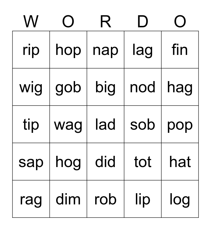 This bingo card has 26 words: did, lip, big, dim, fin, rip, wig, hop, pop, tot, nod, tip, hat, rag, wag, tad, lag, sap, nap, lad, hag, rob, sob, hog, gob and log.