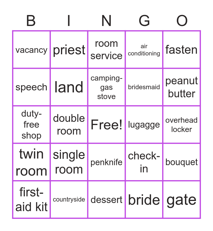 This bingo card has a free space and 40 words: sausages, duty-free shop, take off, land, countryside, penknife, camping-gas stove, peanut butter, fasten, twin room, double room, air conditioning, gate, overhead locker, lugagge, single room, departure hall, vacancy, lift, room service, bouquet, bride, bridesmaid, speech, reception, groom, guessed, get married to, have an argument, ticket, security guard, first-aid kit, seat belt, check-in, peanut butter, dessert, main course, set menu, priest and facilities.