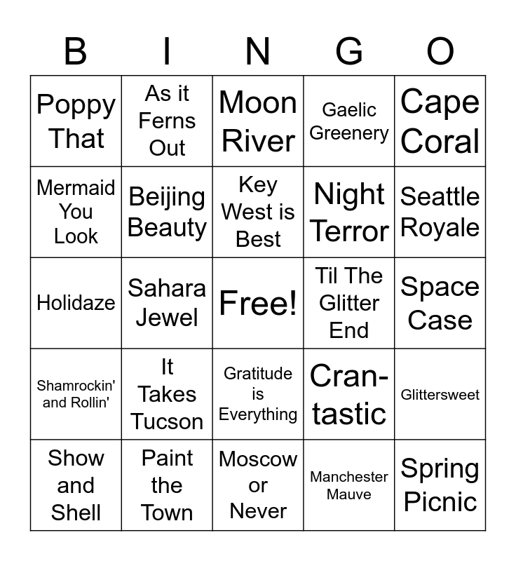 This bingo card has a free space and 24 words: It Takes Tucson, Paint the Town, Key West is Best, Show and Shell, Cape Coral, Poppy That, Mermaid You Look, As it Ferns Out, Til The Glitter End, Gratitude is Everything, Night Terror, Holidaze, Cran-tastic, Glittersweet, Beijing Beauty, Manchester Mauve, Space Case, Moon River, Seattle Royale, Sahara Jewel, Spring Picnic, Shamrockin' and Rollin', Gaelic Greenery and Moscow or Never.