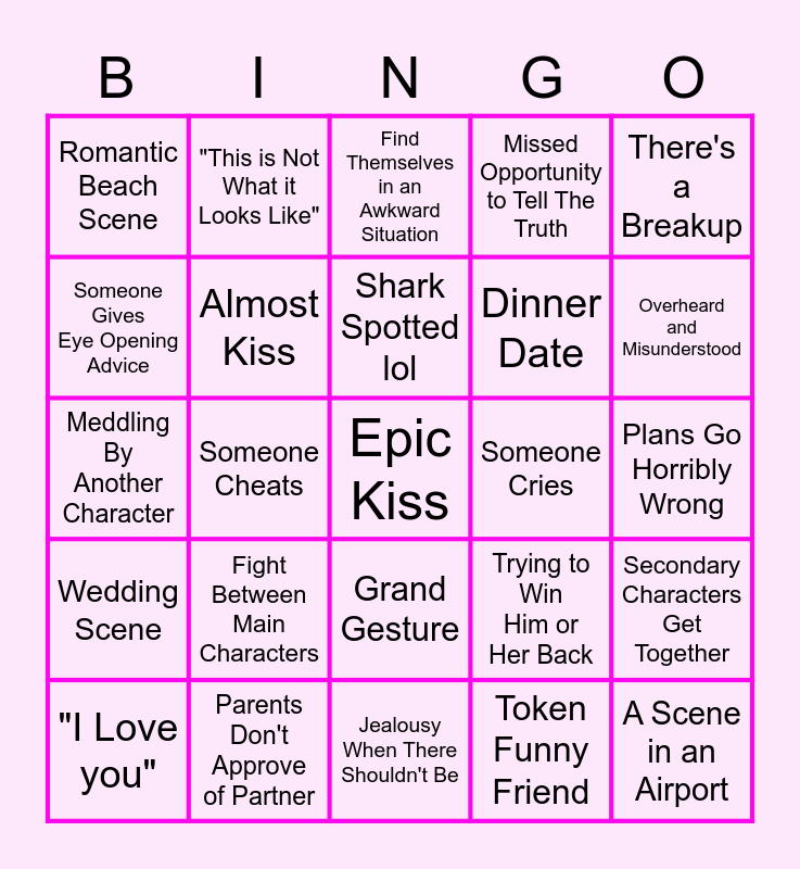 This bingo card has a free space and 29 words: "I Love you", I Lie is Discovered, Someone Cheats, Out of Their Comfort Zone and Enjoying It, Romantic Beach Scene, Find Themselves in an Awkward Situation, Almost Kiss, Fight Between Main Characters, Someone Cries, Parents Don't Approve of Partner, Plans Go Horribly Wrong, A Scene in an Airport, Jealousy When There Shouldn't Be, Token Funny Friend, Overheard and Misunderstood, An Ex Returns, Grand Gesture, Wedding Scene, There's a Breakup, Meddling By Another Character, Trying to Win Him or Her Back, Montage, Dinner Date, Someone Gives Eye Opening Advice, Missed Opportunity to Tell The Truth, "This is Not What it Looks Like", Secondary Characters Get Together, Shark Spotted lol and Re-evaluates the Relationship.