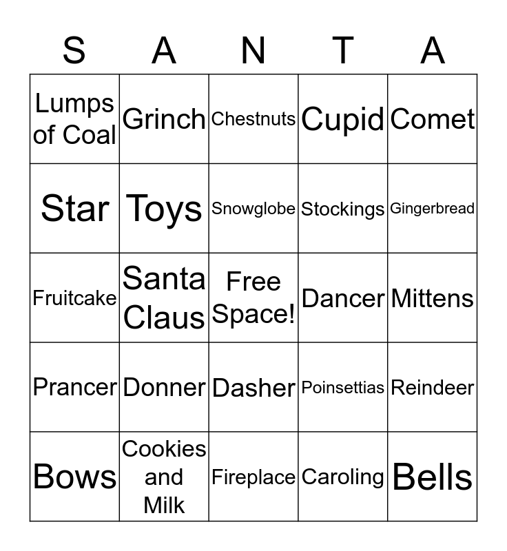 This bingo card has a free space and 44 words: Antlers, Bells, Blitzen, Bows, Candy Canes, Caroling, Chestnuts, Christmas Tree, Comet, Cookies and Milk, Cupid, Dancer, Dasher, Donner, Elf, Fireplace, Frosty the Snowman, Fruitcake, Garland, Gingerbread, Grinch, Hot Chocolate, Lights, Lumps of Coal, Mistletoe, Mittens, North Pole, Ornaments, Poinsettias, Prancer, Presents, Reindeer, Ribbons, Rudolph, Santa Claus, Scrooge, Sleigh, Snowflakes, Snowglobe, Star, Stockings, Trains, Toys and Vixen.