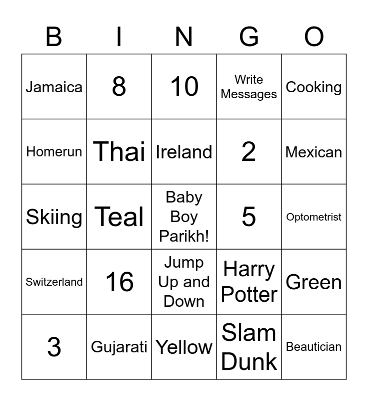 This bingo card has a free space and 24 words: 16, Gujarati, Ireland, 3, Cooking, Jamaica, Homerun, 8, 5, Jump Up and Down, 2, Skiing, Harry Potter, Green, Thai, Slam Dunk, Optometrist, 10, Mexican, Teal, Beautician, Switzerland, Write Messages and Yellow.
