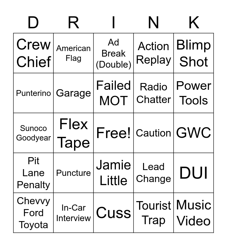 This bingo card has a free space and 24 words: Puncture, In-Car Interview, Failed MOT, Chevvy Ford Toyota, Blimp Shot, Crew Chief, Punterino, American Flag, Caution, Jamie Little, Radio Chatter, Sunoco Goodyear, Lead Change, DUI, Garage, Tourist Trap, GWC, Ad Break (Double), Power Tools, Flex Tape, Music Video, Pit Lane Penalty, Action Replay and Cuss.