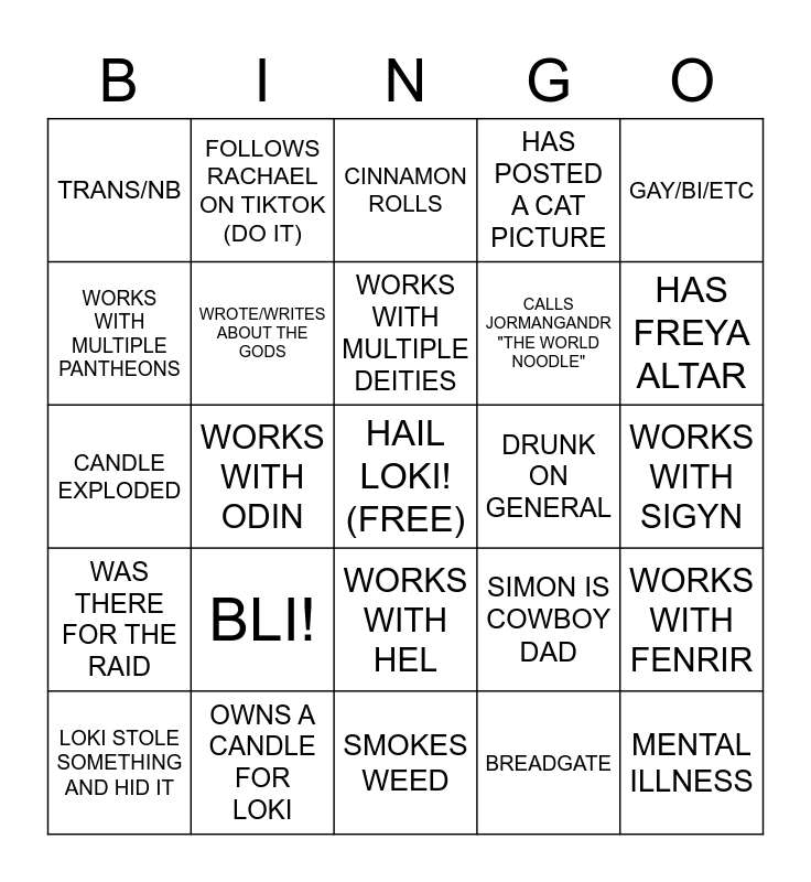 This bingo card has a free space and 24 words: BLI!, OWNS A CANDLE FOR LOKI, WORKS WITH MULTIPLE DEITIES, LOKI STOLE SOMETHING AND HID IT, GAY/BI/ETC, TRANS/NB, WORKS WITH MULTIPLE PANTHEONS, FOLLOWS RACHAEL ON TIKTOK (DO IT), DRUNK ON GENERAL, WORKS WITH HEL, CALLS JORMANGANDR "THE WORLD NOODLE", CANDLE EXPLODED, SIMON IS COWBOY DAD, WORKS WITH FENRIR, WROTE/WRITES ABOUT THE GODS, BREADGATE, WORKS WITH SIGYN, CINNAMON ROLLS, HAS FREYA ALTAR, WORKS WITH ODIN, MENTAL ILLNESS, WAS THERE FOR THE RAID, HAS POSTED A CAT PICTURE and SMOKES WEED.