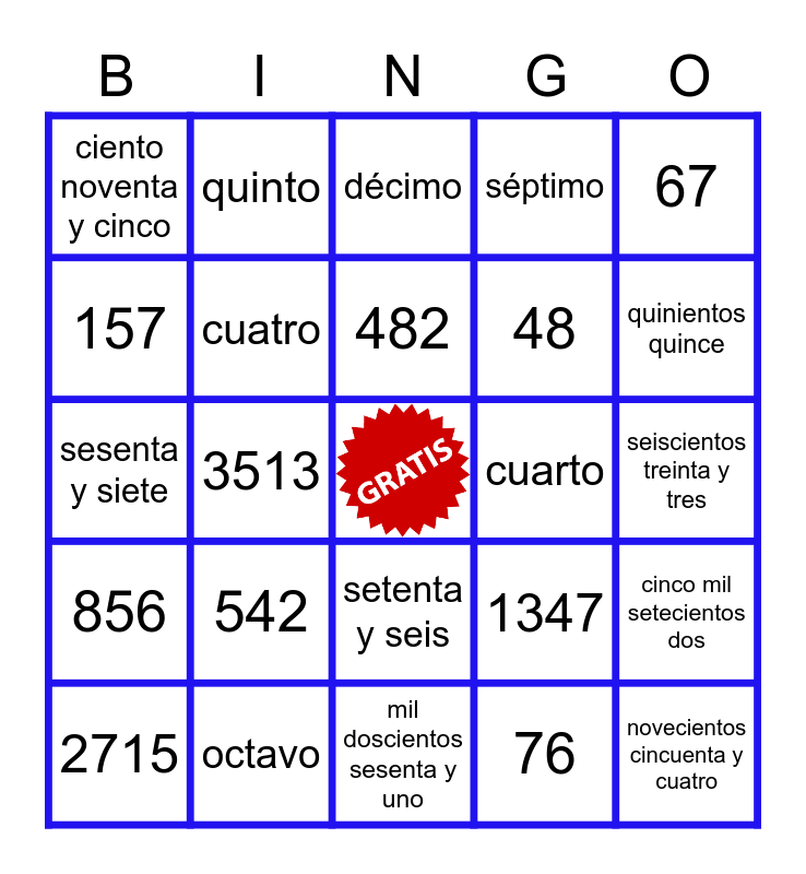 This bingo card has a free space and 24 words: 542, octavo, 482, 2715, 67, ciento noventa y cinco, 157, quinto, cuarto, setenta y seis, 48, sesenta y siete, 1347, cinco mil setecientos dos, cuatro, 76, seiscientos treinta y tres, décimo, quinientos quince, 3513, novecientos cincuenta y cuatro, 856, séptimo and mil doscientos sesenta y uno.