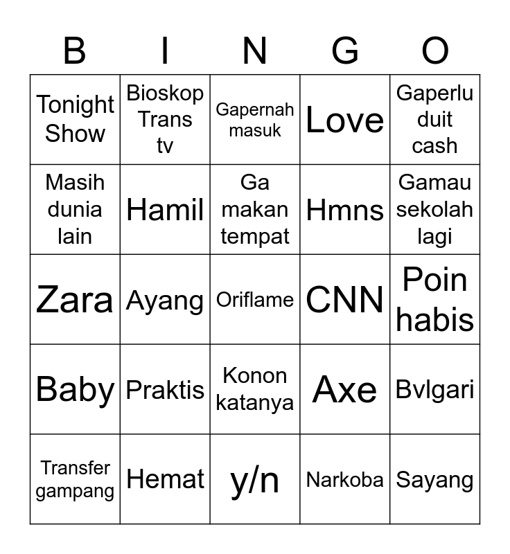 This bingo card has a free space and 24 words: Praktis, Hemat, Ga makan tempat, Transfer gampang, Gaperlu duit cash, Tonight Show, Masih dunia lain, Bioskop Trans tv, CNN, Konon katanya, Hmns, Zara, Axe, Bvlgari, Hamil, Narkoba, Poin habis, Gapernah masuk, Gamau sekolah lagi, Ayang, Sayang, Baby, Love and y/n.