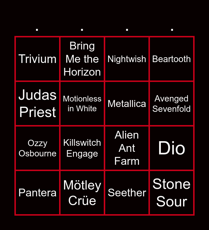 This bingo card has 56 words: Limp Bizkit, Slipknot, System of a Down, Trivium, Five Finger Death Punch, Rob Zombie, Metallica, Iron Maiden, Ozzy Osbourne, Avatar, Beartooth, Ghost, Slayer, Marilyn Manson, KISS, Parkway Drive, Judas Priest, Dio, Motörhead, Pantera, Mötley Crüe, Guns N' Roses, Korn, Nightwish, AC/DC, Avenged Sevenfold, Def Leppard, Steel Panther, Killswitch Engage, King 810, Aerosmith, Rammstein, Disturbed, Nine Inch Nails, Seether, Motionless in White, Alien Ant Farm, Babymetal, Stone Sour, Bring Me the Horizon, Drowning Pool, Godsmack, In Flames, Hollywood Undead, Linkin Park, Nickelback, Red Hot Chili Peppers, Shinedown, Sum 41, The Offspring, Volbeat, Electric Light Orchestra, Mental as Anything, Die Antwoord, Little Big and Daði Freyr.