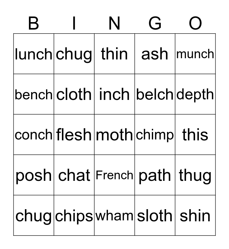 This bingo card has a free space and 24 words: chat, chips, inch, chug, munch, lunch, bench, chug, chimp, French, belch, conch, path, thug, cloth, sloth, this, thin, depth, flesh, shin, posh, ash and wham.
