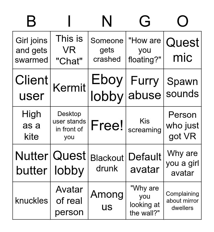 This bingo card has a free space and 24 words: Quest lobby, Avatar of real person, Eboy lobby, knuckles, Quest mic, Girl joins and gets swarmed, Client user, This is VR "Chat", Kis screaming, Blackout drunk, Furry abuse, High as a kite, Default avatar, Why are you a girl avatar, Kermit, "Why are you looking at the wall?", Person who just got VR, Someone gets crashed, Spawn sounds, Desktop user stands in front of you, Complaining about mirror dwellers, Nutter butter, "How are you floating?" and Among us.