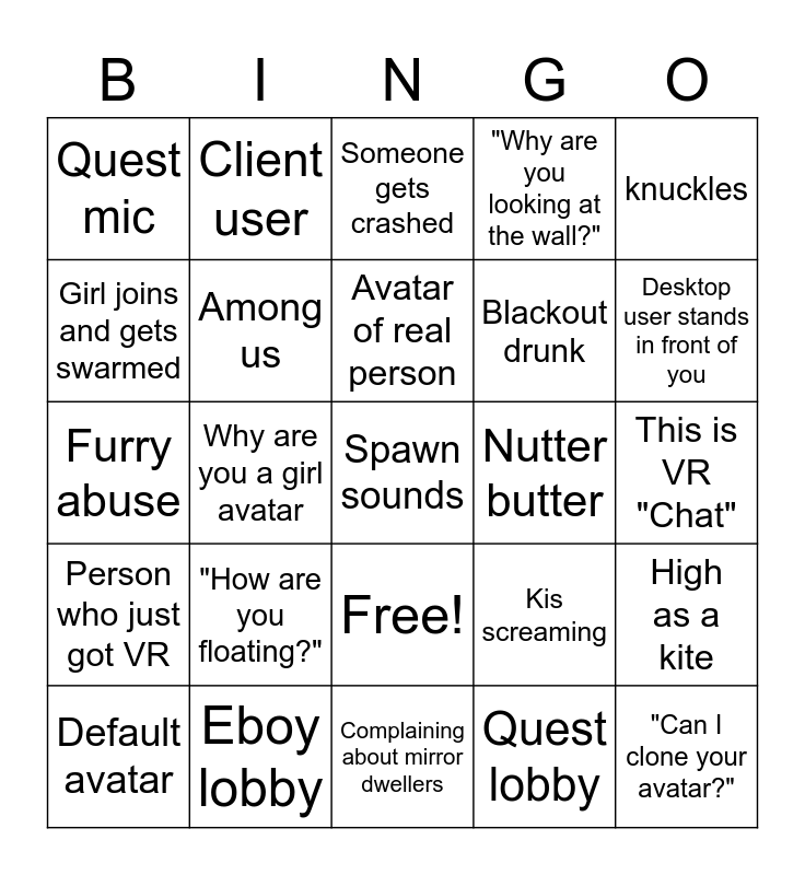 This bingo card has 26 words: Free!, Quest lobby, Avatar of real person, Eboy lobby, knuckles, Quest mic, Girl joins and gets swarmed, Client user, This is VR "Chat", Kis screaming, Blackout drunk, Furry abuse, High as a kite, Default avatar, Why are you a girl avatar, Kermit, "Why are you looking at the wall?", Person who just got VR, Someone gets crashed, Spawn sounds, Desktop user stands in front of you, Complaining about mirror dwellers, Nutter butter, "How are you floating?", Among us and "Can I clone your avatar?".