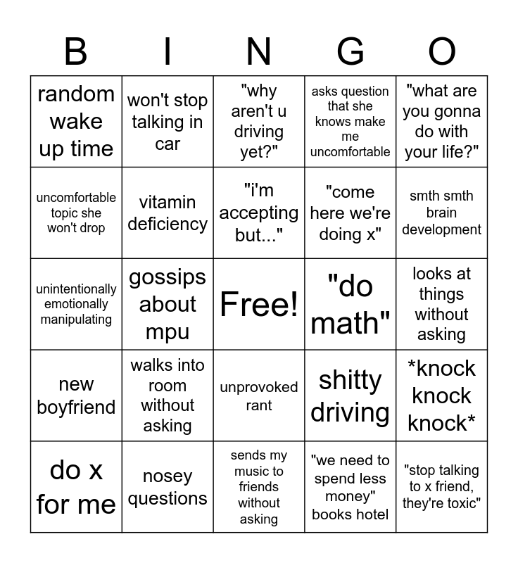 This bingo card has a free space and 24 words: walks into room without asking, nosey questions, "i'm accepting but...", do x for me, "what are you gonna do with your life?", random wake up time, uncomfortable topic she won't drop, won't stop talking in car, "do math", unprovoked rant, "come here we're doing x", unintentionally emotionally manipulating, shitty driving, *knock knock knock*, vitamin deficiency, "we need to spend less money" books hotel, looks at things without asking, "why aren't u driving yet?", smth smth brain development, gossips about mpu, "stop talking to x friend, they're toxic", new boyfriend, asks question that she knows make me uncomfortable and sends my music to friends without asking.