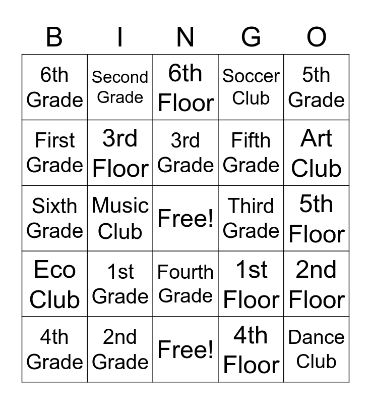 This bingo card has a free space and 24 words: 1st Grade, 2nd Grade, 3rd Grade, 4th Grade, 5th Grade, 6th Grade, First Grade, Second Grade, Third Grade, Fourth Grade, Fifth Grade, Sixth Grade, 1st Floor, 2nd Floor, 3rd Floor, 4th Floor, 5th Floor, 6th Floor, Art Club, Music Club, Dance Club, Eco Club, Soccer Club and Free!.