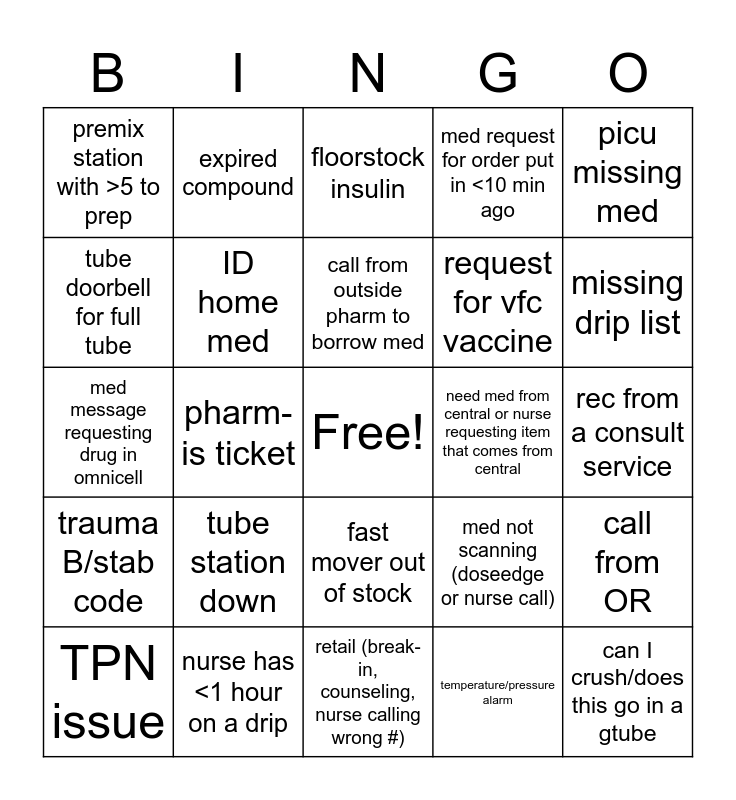 This bingo card has a free space and 43 words: compatibility question/interaction question, can I crush/does this go in a gtube, call out/or >10 min late, TPN issue, stat alteplase, temperature/pressure alarm, floorstock insulin, code response needed, picu missing med, nurse has <1 hour on a drip, med request for order put in <10 min ago, need med from central or nurse requesting item that comes from central, fast mover out of stock, tube station down, miss-filled med, retail (break-in, counseling, nurse calling wrong #), call to borrow a med, med message requesting drug in omnicell, need new tackle box, missing drip list, expired compound, smog compound, new chemo/chemo issue, premix station with >5 to prep, page or call NNP, rec from a consult service, med sent secure returns in tube, omnicell discrepancy, med not scanning (doseedge or nurse call), trauma B/stab code, expired med (not compound), call from OR, new DKA needs bags STAT, pharm-is ticket, doseedge bypass, brand new TPN, new LOS/EOS orders, call from outside pharm to borrow med, tube doorbell for full tube, request for vfc vaccine, recon antibiotic, ID home med and status board clear.