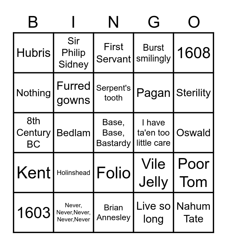This bingo card has 25 words: Holinshead, Brian Annesley, Serpent's tooth, 1603, 1608, Hubris, Nothing, Sir Philip Sidney, I have ta'en too little care, Folio, Pagan, 8th Century BC, Vile Jelly, Poor Tom, Furred gowns, Nahum Tate, Oswald, First Servant, Sterility, Bedlam, Base, Base, Bastardy, Never, Never,Never, Never,Never, Kent, Burst smilingly and Live so long.