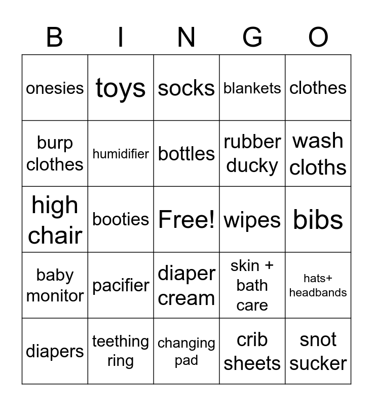 This bingo card has a free space and 24 words: pacifier, teething ring, bottles, diapers, clothes, onesies, burp clothes, toys, wipes, diaper cream, rubber ducky, high chair, skin + bath care, hats+ headbands, humidifier, crib sheets, bibs, socks, wash cloths, booties, snot sucker, baby monitor, blankets and changing pad.