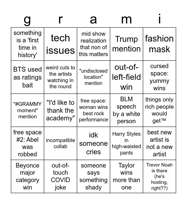 This bingo card has a free space and 24 words: incompatible collab, out-of-touch COVID joke, "undisclosed location" mention, Beyonce major category win, fashion mask, something is a 'first time in history', BTS used as ratings bait, tech issues, BLM speech by a white person, idk someone cries, out-of-left-field win, "#GRAMMY moment" mention, Harry Styles in high-waisted pants, best new artist is not a new artist, weird cuts to the artists watching in the round, Taylor wins more than one, things only rich people would get™, mid show realization that non of this matters, cursed space: yummy wins, "I'd like to thank the academy", Trevor Noah is there (he's hosting, right??), free space #2: Abel was robbed, Trump mention and someone says something shady.