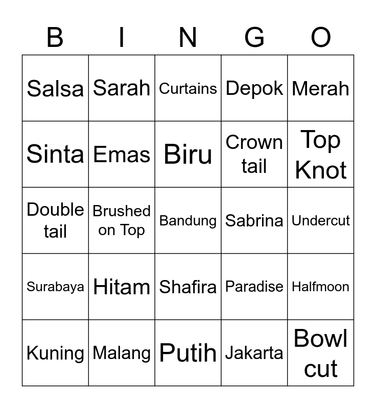 This bingo card has 25 words: Hitam, Putih, Biru, Kuning, Merah, Salsa, Sinta, Sarah, Sabrina, Shafira, Crown tail, Double tail, Paradise, Halfmoon, Emas, Bowl cut, Undercut, Curtains, Top Knot, Brushed on Top, Bandung, Malang, Surabaya, Depok and Jakarta.