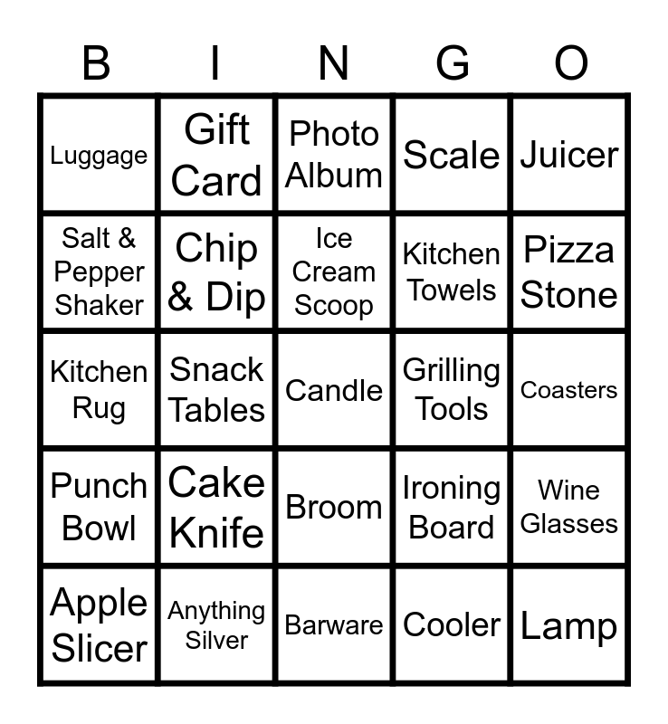 This bingo card has a free space and 24 words: Cake Knife, Anything Silver, Ice Cream Scoop, Apple Slicer, Juicer, Luggage, Salt & Pepper Shaker, Gift Card, Grilling Tools, Broom, Kitchen Towels, Kitchen Rug, Ironing Board, Wine Glasses, Chip & Dip, Cooler, Coasters, Photo Album, Pizza Stone, Snack Tables, Lamp, Punch Bowl, Scale and Barware.