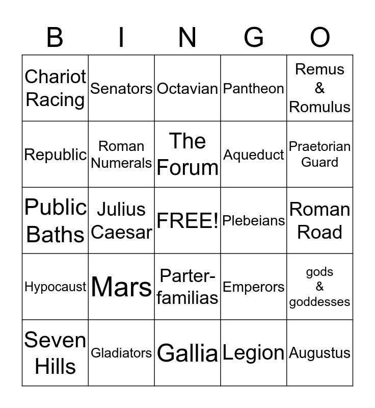 This bingo card has a free space and 24 words: Mars, Gladiators, The Forum, Seven Hills, Remus & Romulus, Chariot Racing, Republic, Senators, Plebeians, Parter- familias, Aqueduct, Public Baths, Emperors, gods & goddesses, Roman Numerals, Legion, Roman Road, Octavian, Praetorian Guard, Julius Caesar, Augustus, Hypocaust, Pantheon and Gallia.