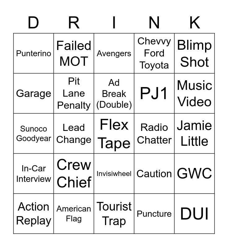 This bingo card has a free space and 24 words: Crew Chief, American Flag, Ad Break (Double), Action Replay, Blimp Shot, Punterino, Garage, Failed MOT, Radio Chatter, Invisiwheel, PJ1, Sunoco Goodyear, Caution, GWC, Pit Lane Penalty, Puncture, Jamie Little, Avengers, Music Video, Lead Change, DUI, In-Car Interview, Chevvy Ford Toyota and Tourist Trap.