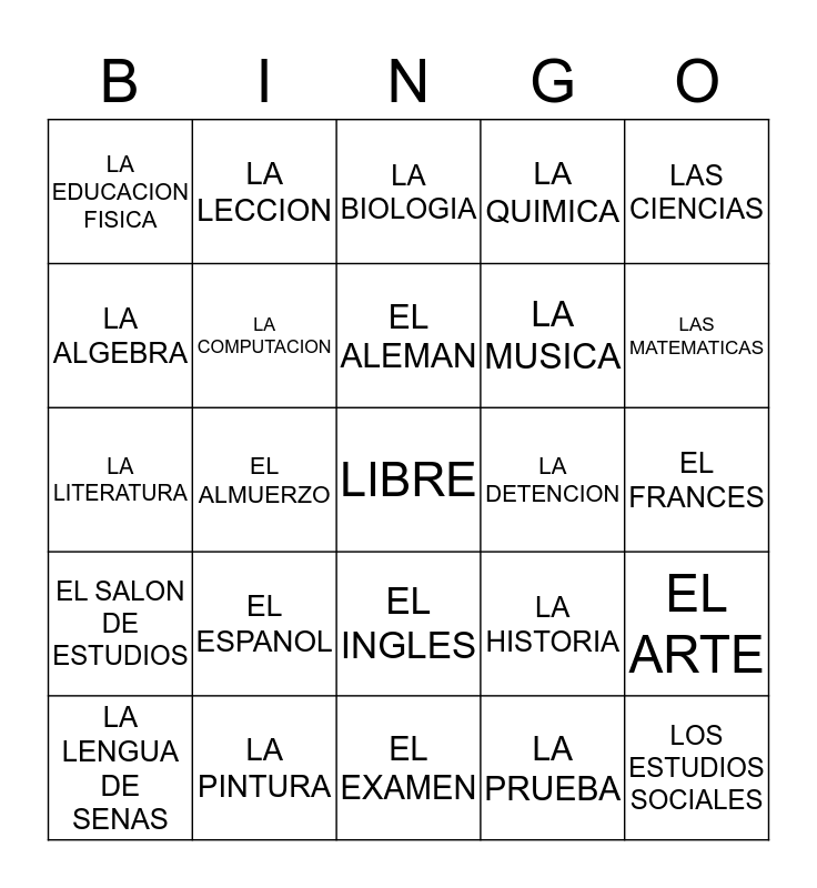 This bingo card has a free space and 24 words: EL ESPANOL, LA PINTURA, EL ALEMAN, LA LENGUA DE SENAS, LAS CIENCIAS, LA EDUCACION FISICA, LA ALGEBRA, LA LECCION, LA DETENCION, EL INGLES, LA MUSICA, LA LITERATURA, LA HISTORIA, EL ARTE, LA COMPUTACION, LA PRUEBA, EL FRANCES, LA BIOLOGIA, LAS MATEMATICAS, EL ALMUERZO, LOS ESTUDIOS SOCIALES, EL SALON DE ESTUDIOS, LA QUIMICA and EL EXAMEN.