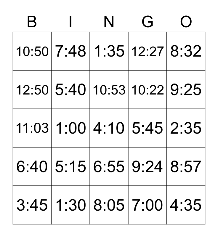This bingo card has a free space and 29 words: 3:45, 2:40, 1:00, 12:15, 10:50, 1:35, 5:40, 5:15, 5:45, 1:30, 2:35, 4:35, 8:05, 7:00, 9:25, 10:20, 6:55, 6:40, 8:32, 11:03, 9:24, 7:17, 10:22, 12:50, 12:27, 7:48, 8:57, 10:53 and 11:44.