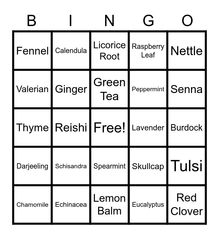 This bingo card has a free space and 25 words: Schisandra, Lemon Balm, Green Tea, Chamomile, Nettle, Fennel, Valerian, Calendula, Lavender, Spearmint, Peppermint, Thyme, Skullcap, Tulsi, Ginger, Dandelion, Burdock, Licorice Root, Senna, Reishi, Red Clover, Echinacea, Darjeeling, Raspberry Leaf and Eucalyptus.