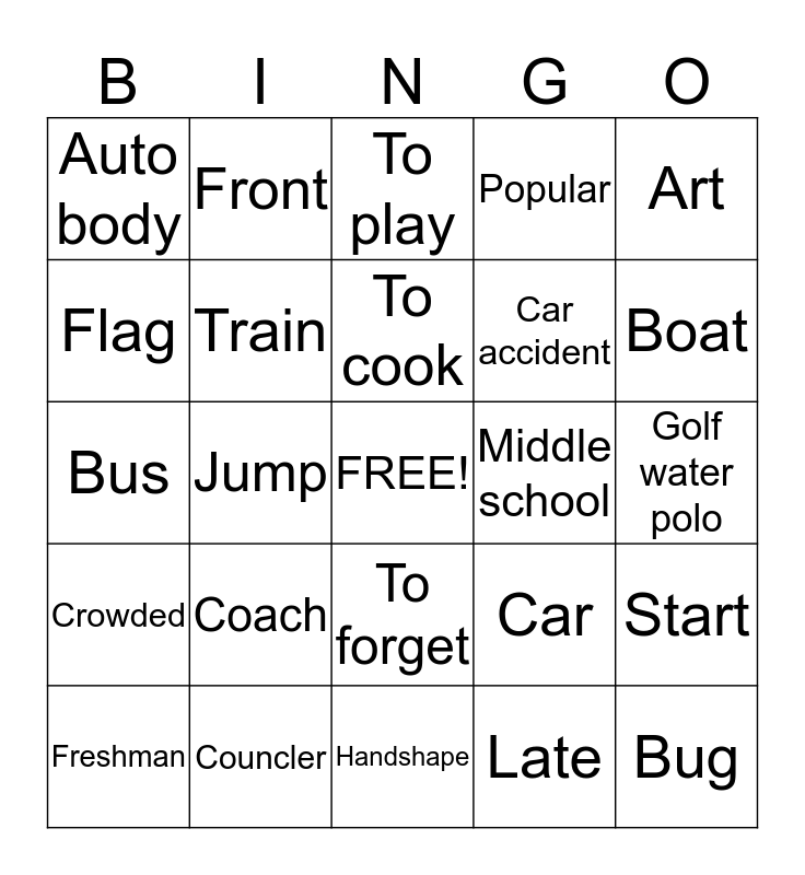 This bingo card has a free space and 24 words: Coach, Councler, To cook, Freshman, Art, Auto body, Flag, Front, Middle school, To forget, Car accident, Bus, Car, Start, Train, Late, Golf water polo, To play, Boat, Jump, Bug, Crowded, Popular and Handshape.