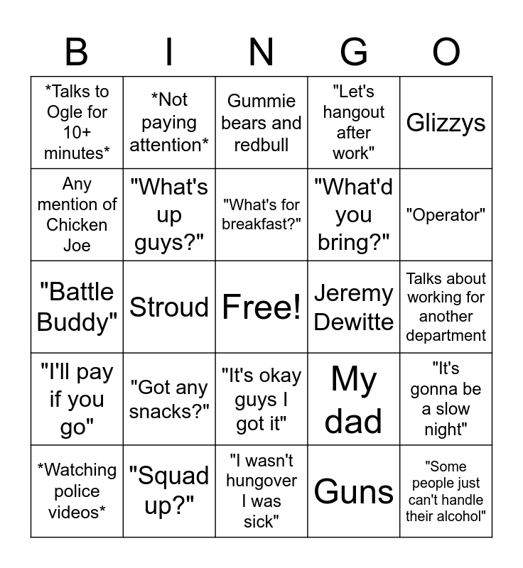 This bingo card has a free space and 34 words: Quiktrip, Guns, Democrats, Any mention of katanas, "I'll pay if you go", "What's up guys?", Glizzys, *Watching police videos*, *Not paying attention*, Twisted Trompo, "What's for breakfast?", Gummie bears and redbull, "I got gloves in the car", Motorone, Jeremy Dewitte, "Operator", "Squad up?", "Battle Buddy", "Got any snacks?", My dad, "It's okay guys I got it", "I've been cool with you haven't I?", *Talks to Ogle for 10+ minutes*, Talks about working for another department, "I wasn't hungover I was sick", "Some people just can't handle their alcohol", "Let's hangout after work", Lasertag, "What'd you bring?", Any mention of Chicken Joe, "Okay I'll shutup then", Stroud, "It's gonna be a slow night" and "Simmer down".