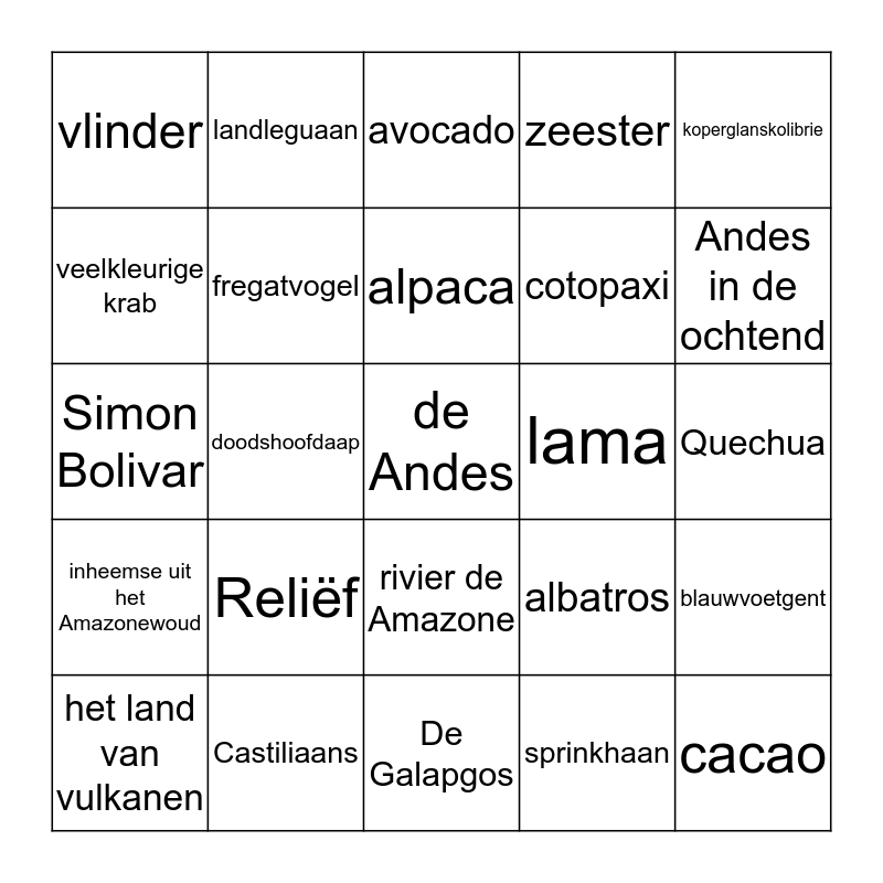 This bingo card has 48 words: de kust, de Andes, de Amazone, De Galapgos, Reliëf, zeeleguaan, landleguaan, landschildpad, veelkleurige krab, zeeleeuw, fregatvogel, zeester, blauwvoetgent, albatros, waterschildpad, brilbeer, alpaca, lama, condor, koperglanskolibrie, doodshoofdaap, sprinkhaan, vlinder, cotopaxi, lopen door de wolken, Andes in de ochtend, het land van vulkanen, churute, rivier de Amazone, inheemse uit het Amazonewoud, President Rafael Correo, Anne Malherbe, sucre, Quito, Castiliaans, andere inheemse talen, Shuar, Quechua, meer dan 30 actieve vulkanen, rode aardappelen, zwarte aardappelen, cacao, avocado, Francisco Pizarro, Simon Bolivar, Atahualpa, petroleum in de Amazone and protest in de Amazone.