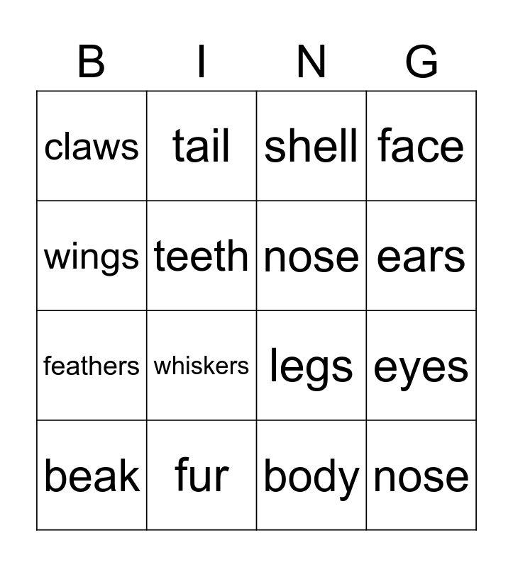 This bingo card has 16 words: beak, fur, shell, face, wings, tail, legs, eyes, claws, teeth, body, ears, feathers, whiskers, nose and nose.