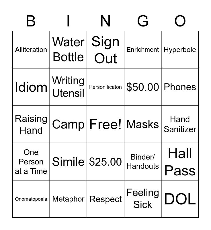 This bingo card has a free space and 24 words: Simile, Metaphor, Personificaton, Onomatopoeia, Hyperbole, Alliteration, Idiom, Water Bottle, Masks, $25.00, $50.00, Raising Hand, Binder/ Handouts, Hall Pass, Writing Utensil, Feeling Sick, Hand Sanitizer, Sign Out, Phones, Camp, DOL, One Person at a Time, Enrichment and Respect.