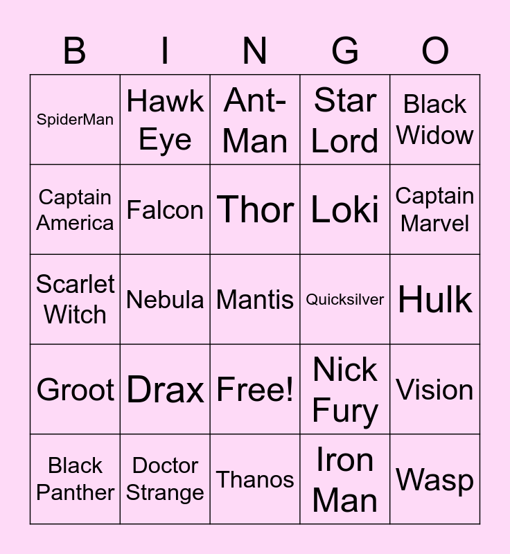 This bingo card has 26 words: Free!, Iron Man, Thor, Doctor Strange, Black Widow, SpiderMan, Captain America, Hawk Eye, Hulk, Nick Fury, Loki, Scarlet Witch, Vision, Black Panther, Nebula, Gamora, Star Lord, Groot, Ant-Man, Mantis, Captain Marvel, Thanos, Quicksilver, Drax, Falcon and Wasp.