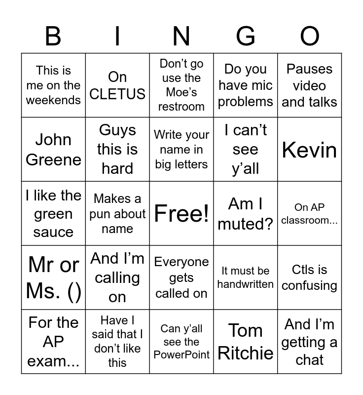 This bingo card has a free space and 24 words: For the AP exam..., And I’m calling on, Write your name in big letters, Tom Ritchie, Pauses video and talks, This is me on the weekends, On CLETUS, Don’t go use the Moe’s restroom, Am I muted?, On AP classroom..., I like the green sauce, Guys this is hard, It must be handwritten, Ctls is confusing, John Greene, Have I said that I don’t like this, Can y’all see the PowerPoint, Do you have mic problems, Kevin, Mr or Ms. (), Makes a pun about name, Everyone gets called on, I can’t see y’all and And I’m getting a chat.