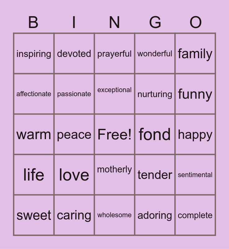 This bingo card has a free space and 24 words: love, caring, exceptional, sweet, family, inspiring, affectionate, devoted, fond, motherly, nurturing, warm, tender, sentimental, passionate, adoring, happy, prayerful, funny, peace, complete, life, wonderful and wholesome.