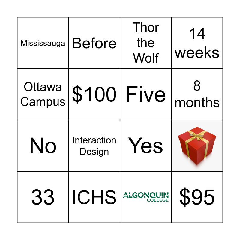 This bingo card has 4 images and 20 words: Three, 1967, 8 months, 8 weeks, Ottawa Campus, Mississauga, $100, Before, ICHS, Bruno the Bruin, No, Yes, Technology, the First Nations Peoples, Five, Thor the Wolf, Interaction Design, 33, $95 and 14 weeks.