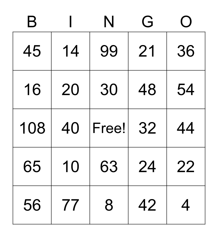 This bingo card has a free space and 48 words: 2, 4, 6, 8, 10, 12, 14, 15, 16, 18, 20, 21, 22, 24, 27, 28, 30, 32, 35, 36, 40, 42, 45, 48, 50, 54, 56, 60, 63, 65, 68, 70, 72, 80, 77, 66, 55, 44, 33, 88, 90, 96, 99, 100, 108, 121, 124 and 110.
