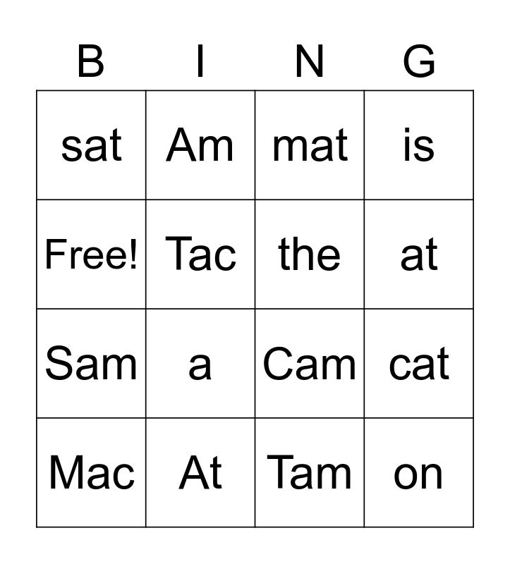 This bingo card has 16 words: At, cat, mat, sat, Sam, Am, Cam, Tam, Free!, Tac, Mac, is, a, at, the and on.