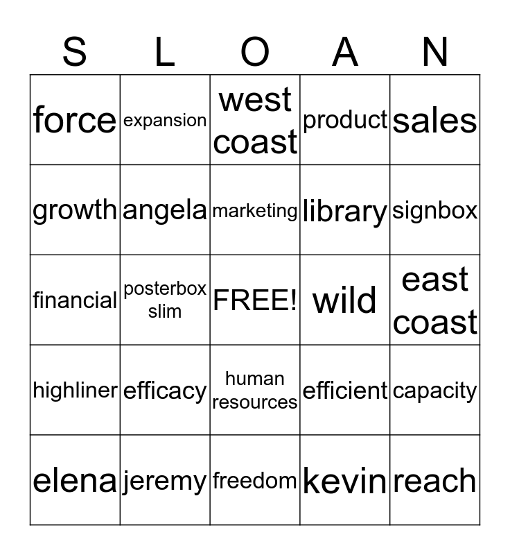 This bingo card has a free space and 24 words: efficacy, jeremy, marketing, elena, sales, force, growth, expansion, wild, human resources, library, financial, efficient, capacity, angela, kevin, east coast, west coast, signbox, posterbox slim, reach, highliner, product and freedom.