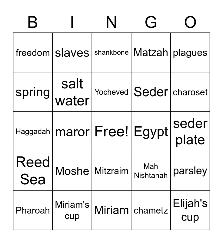 This bingo card has a free space and 25 words: Moshe, Miriam, Yocheved, Pharoah, plagues, freedom, spring, slaves, Egypt, Mitzraim, Seder, Haggadah, Mah Nishtanah, parsley, salt water, egg, seder plate, shankbone, charoset, maror, Elijah's cup, Miriam's cup, Reed Sea, Matzah and chametz.
