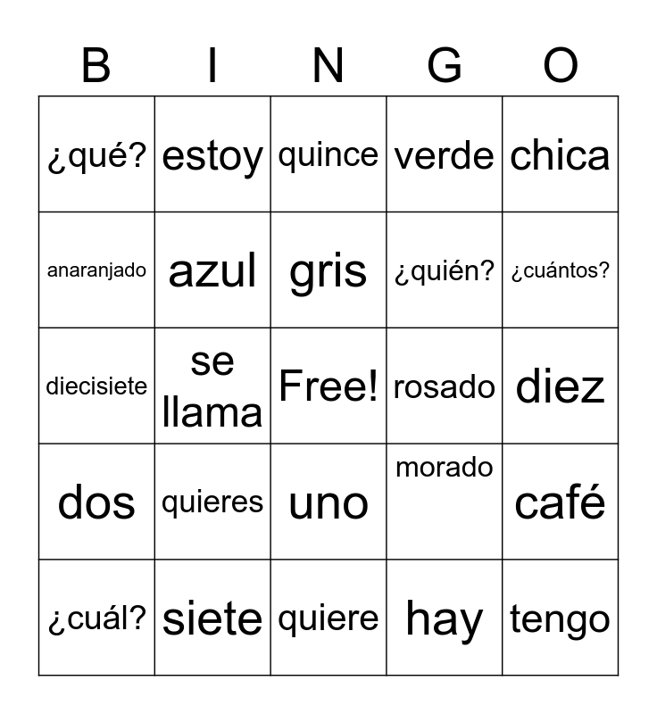 This bingo card has a free space and 48 words: tiene, tengo, tienes, quiere, quieres, quiero, estoy, rojo, anaranjado, amarillo, azul, verde, café, morado, negro, blanco, gris, rosado, chico, chica, se llama, hay, ¿qué?, ¿quién?, ¿cuándo?, ¿cuántos?, ¿cuál?, ¿por qué?, uno, dos, tres, cuatro, cinco, seis, siete, ocho, nueve, diez, once, doce, trece, catorce, quince, dieciséis, diecisiete, dieciocho, diecinueve and veinte.