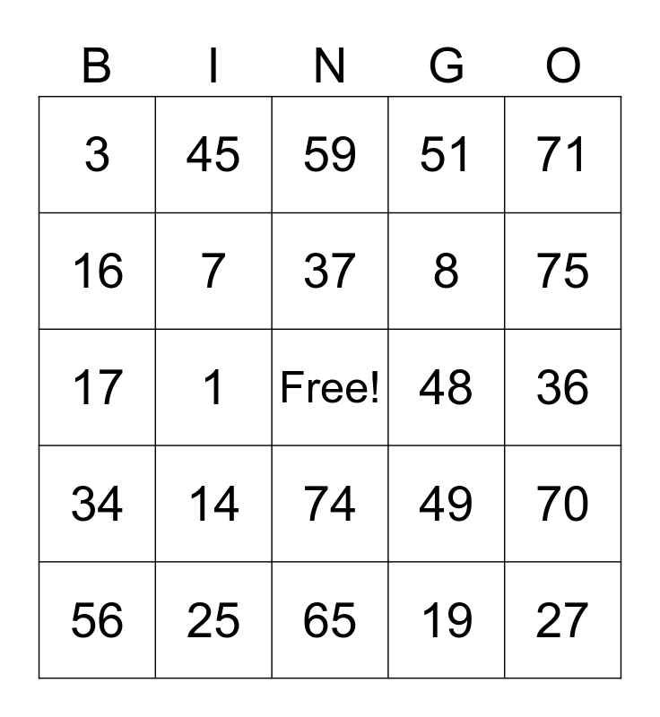 This bingo card has a free space and 24 words: 14, 25, 37, 56, 71, 3, 16, 45, 48, 74, 8, 17, 49, 70, 7, 19, 36, 59, 75, 1, 27, 34, 51 and 65.