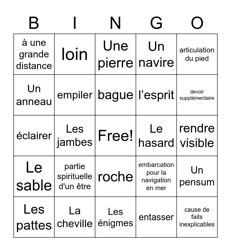 This bingo card has a free space and 28 words: Un pensum, se tromper de, l’esprit, entasser, Un anneau, Une pierre, loin, Le sable, Le hasard, Les pattes, éclairer, Un navire, La cheville, Les énigmes, devoir supplémentaire, confondre, partie spirituelle d'un être, empiler, bague, roche, à une grande distance, sédiments formés de petits grains, cause de faits inexplicables, Les jambes, rendre visible, embarcation pour la navigation en mer, articulation du pied and jeu d'esprit.
