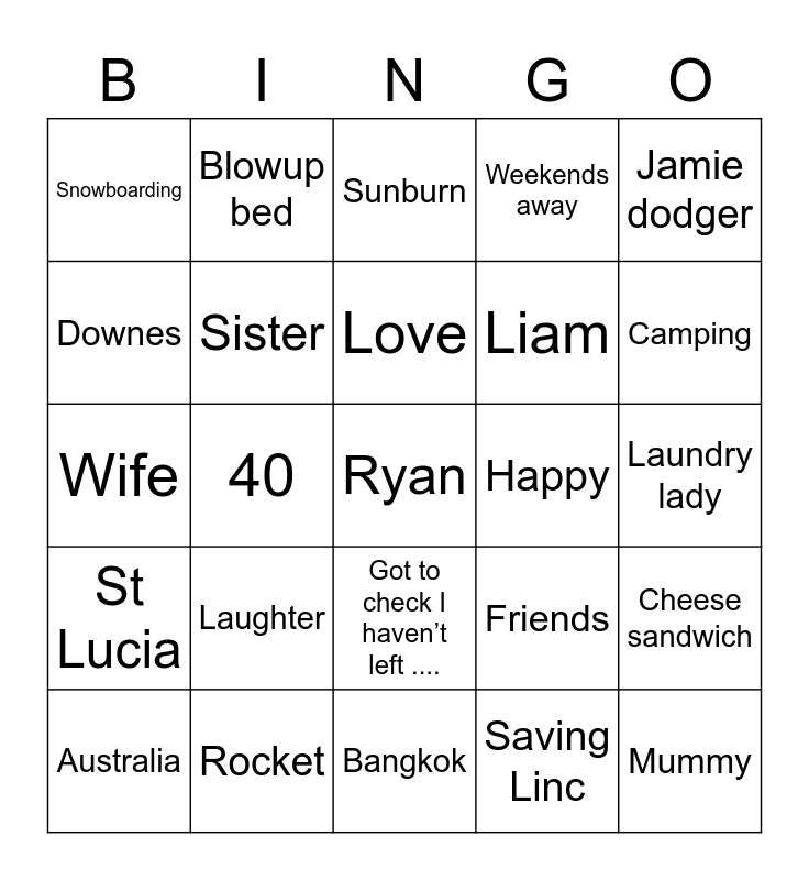 This bingo card has 40 words: Shots, 40, Liam, Friends, Mummy, Wife, Sister, Auntie, Liam, Cheese sandwich, Snowboarding, Blowup bed, Ryan, Saving Linc, Laundry lady, Downes, Mini teeth, Sunburn, Happy birthday, Jamie dodger, St Lucia, Rocket, Love, Happy, Claire, Cocktails, Super women, Celebrate, Holidays, Drunkness, Kebab, Laughter, Got to check I haven’t left ...., Ibiza, Camping, Australia, Portugal, Bangkok, Weekends away and Key west.