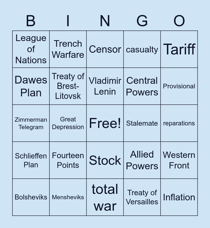 This bingo card has a free space and 27 words: Allied Powers, Arms Race, Central Powers, total war, Dawes Plan, Censor, Trench Warfare, Schlieffen Plan, Stalemate, Western Front, Zimmerman Telegram, casualty, Bolsheviks, Mensheviks, Provisional, Soviets, Treaty of Brest-Litovsk, Vladimir Lenin, Fourteen Points, League of Nations, reparations, Treaty of Versailles, Great Depression, Inflation, Stock, Tariff and Weimar Republic.