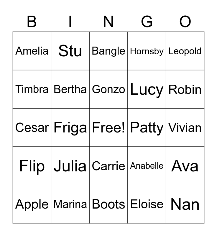This bingo card has a free space and 24 words: Apple, Julia, Gonzo, Eloise, Leopold, Amelia, Stu, Bangle, Patty, Vivian, Cesar, Bertha, Anabelle, Ava, Timbra, Marina, Boots, Hornsby, Robin, Flip, Friga, Carrie, Lucy and Nan.