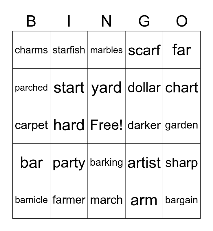 This bingo card has a free space and 24 words: party, farmer, yard, barnicle, far, charms, parched, starfish, darker, barking, dollar, carpet, artist, sharp, start, arm, garden, marbles, chart, hard, bargain, bar, scarf and march.