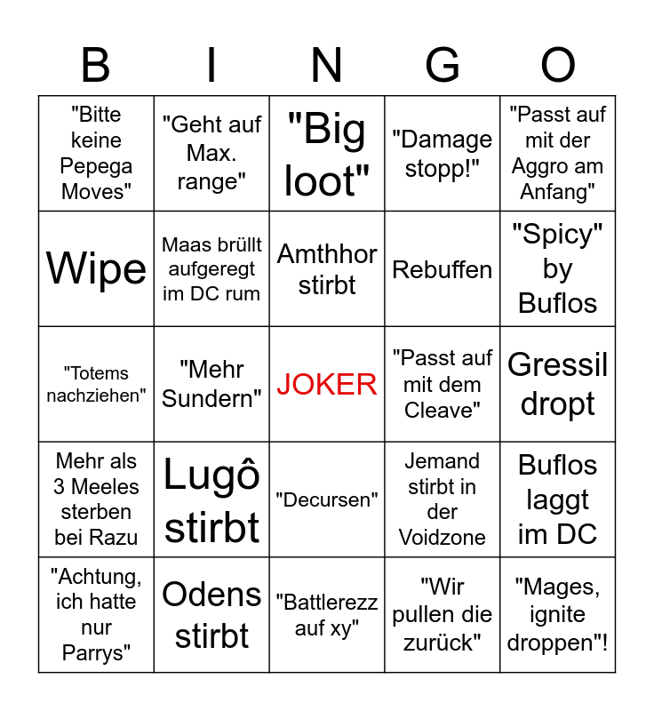 This bingo card has a free space and 24 words: Lugô stirbt, Odens stirbt, Amthhor stirbt, "Achtung, ich hatte nur Parrys", "Passt auf mit der Aggro am Anfang", "Bitte keine Pepega Moves", Wipe, "Geht auf Max. range", "Passt auf mit dem Cleave", "Decursen", Rebuffen, "Totems nachziehen", Jemand stirbt in der Voidzone, Buflos laggt im DC, Maas brüllt aufgeregt im DC rum, "Wir pullen die zurück", Gressil dropt, "Big loot", "Spicy" by Buflos, "Mehr Sundern", "Mages, ignite droppen"!, Mehr als 3 Meeles sterben bei Razu, "Damage stopp!" and "Battlerezz auf xy".